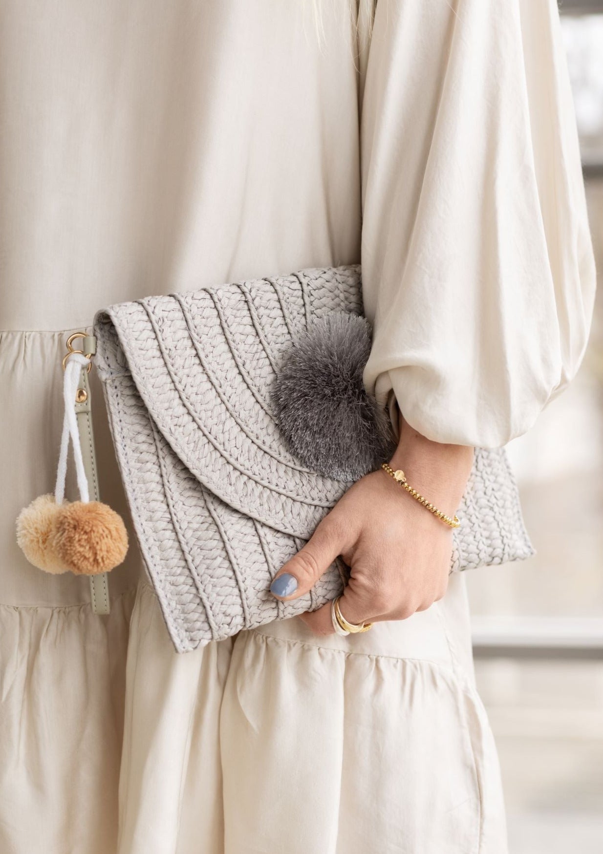 - Seitliche abnehmbare Bommeln in Beige